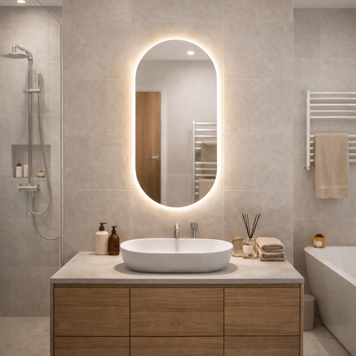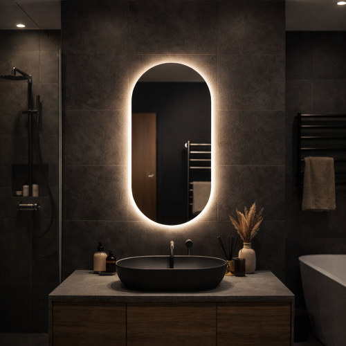 Mogućnost dodatka ALU profila sa difuzorom radi sakrivanja LED dioda i ravnomernije raspodele svetlosti. Cena zavisi od dimezije i oblika ogledala. Na upit.